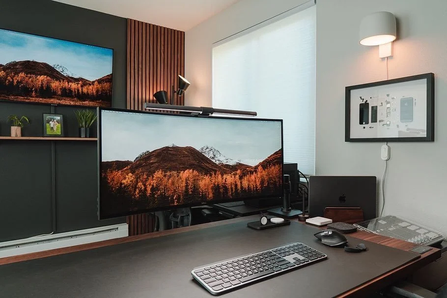 Architect and content creator Jon Imperial (@jonimperial) comes next. His setup is intentional and clean with a wood and gray scheme. We’re featuring his work setup, but he also has a gaming space in the same room without it being cluttered.